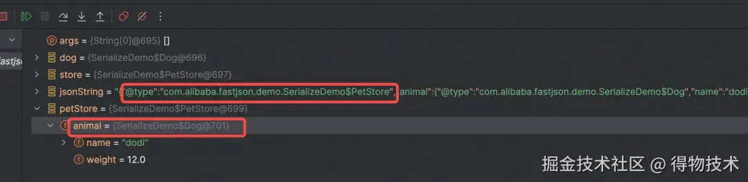 在未开启AutoType机制情况下,在将store对象序列化成JSON串后,再反序列化为对象时由于字段的类型为接口无法转换成具体的Dog类型示例;开启AutoType机制后,序列化时将类型一并写入到JSON串内,后续进行反序列化时可以根据这个类型还原成具体的类型实例。