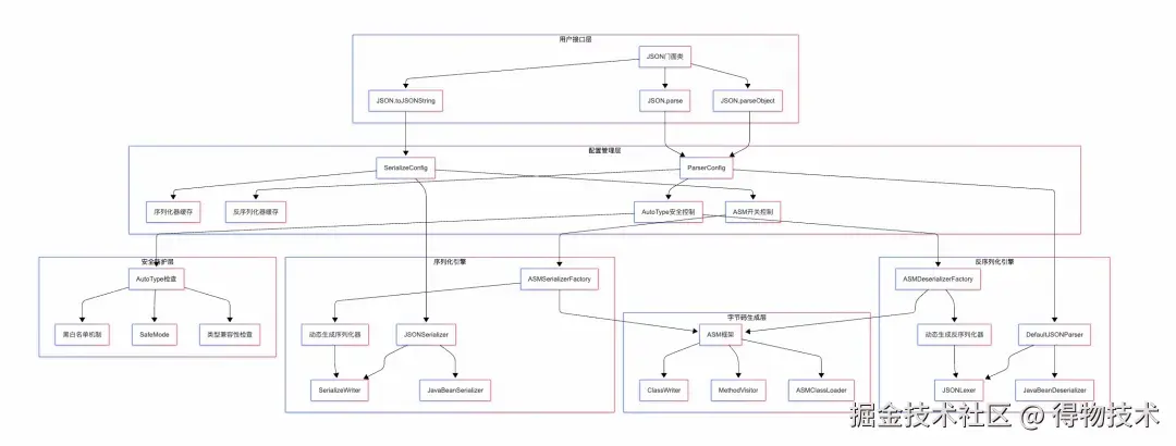 - ASMSerializerFactory.java: 性能优化的核心 。它使用 ASM 字节码技术在运行时动态生成序列化器类,这些类直接调用 getter 方法并操作SerializeWriter,避免了反射的性能开销。