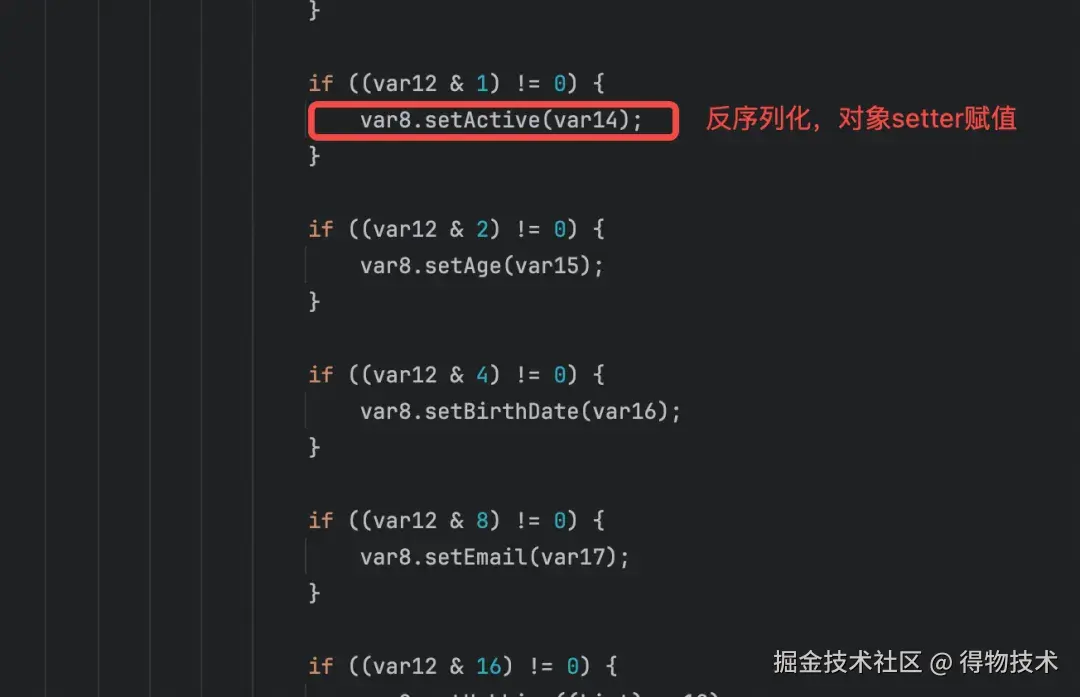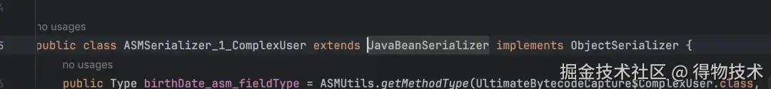 ASM 是 fastjson 类似于 JIT,在运行时把「反射调用」翻译成「直接字段访问 + 方法调用」的字节码,从而把序列化/反序列化性能提升 20% 以上,当然随着JVM对反射性能的优化性能差正在逐渐被缩小。下图是作者使用工具类读取的动态序列化/反序列化器源码片段。