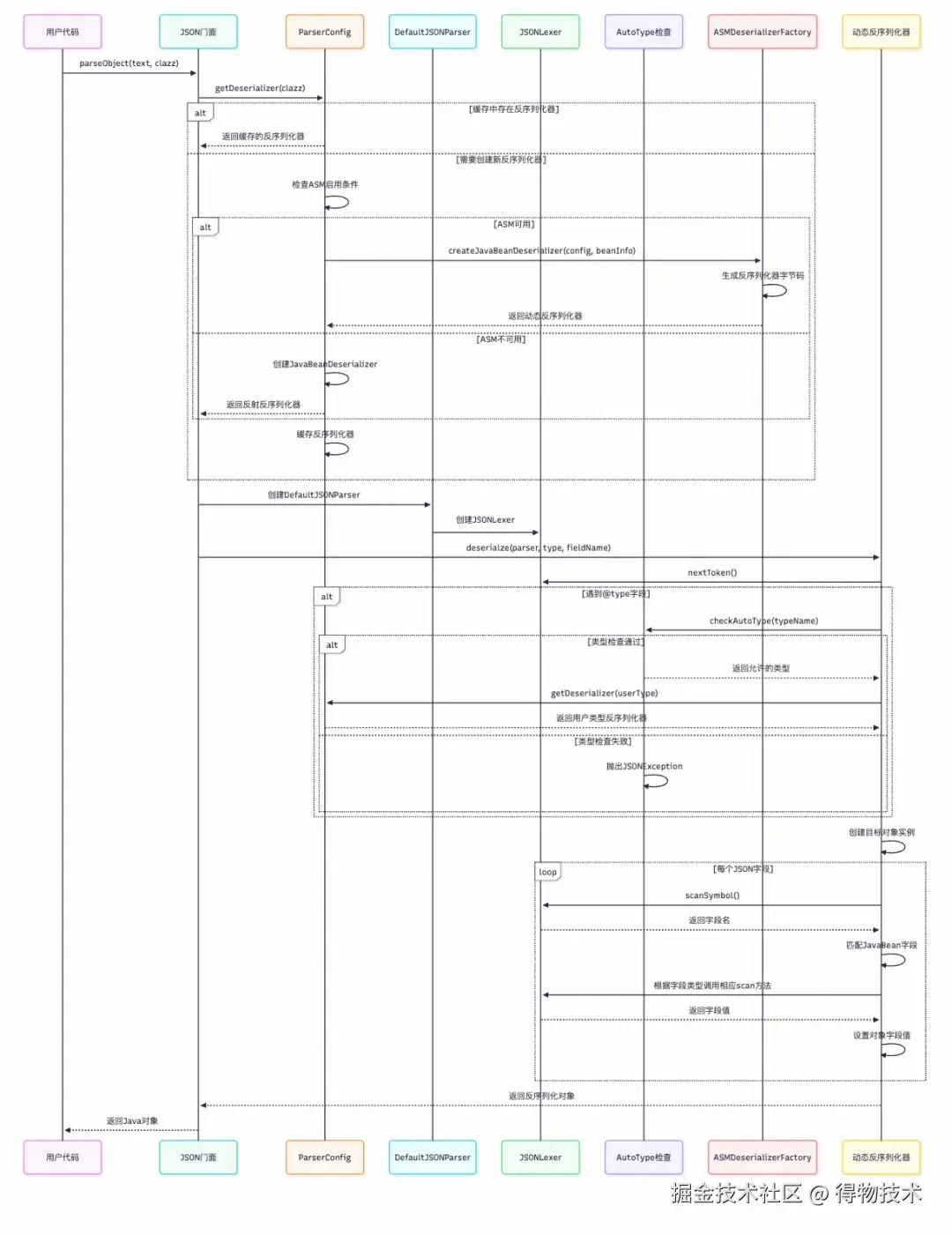 Fastjson通过JSON.parseObject()门面API调用DefaultJSONParser控制器,利用JSONLexer进行词法分析解析JSON字符串,经过AutoType安全检查后使用ASM字节码生成动态反序列化器或反射机制创建Java对象实例并逐字段赋值。