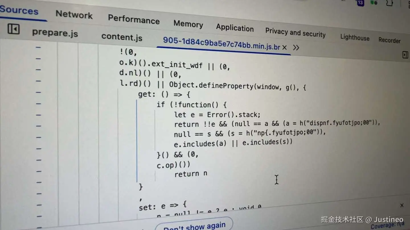 找能够复现的朋友帮忙查看,果然发现一段类似的代码,只不过用了 Error().stack 来检查脚本来源: