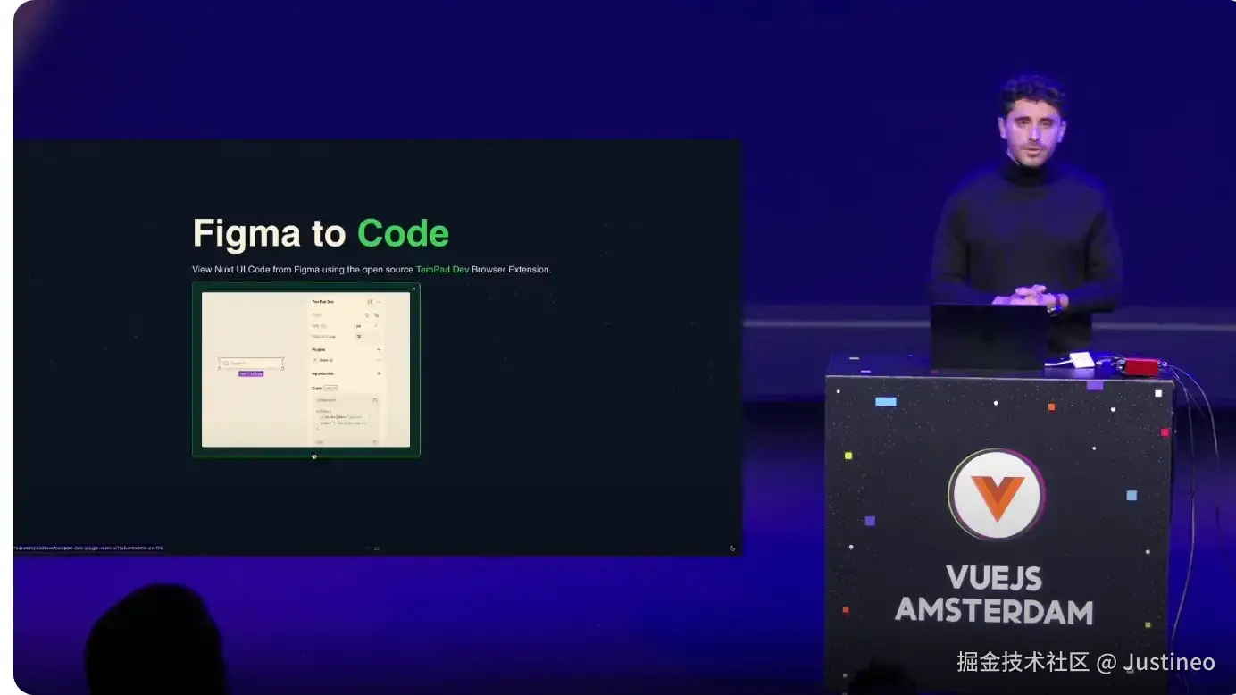NuxtLabs 的创始人 Sebastien Chopin 在 VueJS Amsterdam 2025 大会的演讲中也对 TemPad Dev 的 Nuxt UI 插件进行了展示