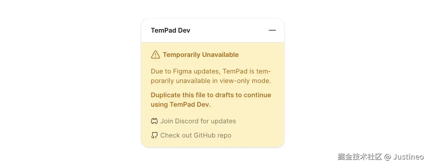 为了应对 Figma 频繁的前端构建更新,我们把替换逻辑抽象成规则集——每条规则定义要匹配的模式和替换模板。每次因为改版或者打包造成替换规则失效时,只要经过快速的单步调试和修改规则,就能较快地修复问题。为了避免用户在修复前的窗口期发现 TemPad Dev 的 Inspect 面板不渲染而产生困惑,我们添加了错误提示,将用户导流到我们的 Discord 频道GitHub repo,方便我们快速发现和解决问题。