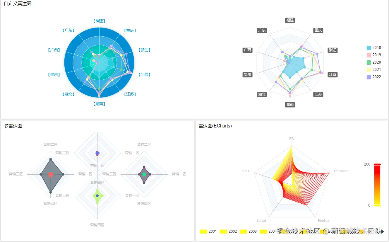 **(1)特点:**雷达图适用于多维数据(四维以上),且每个维度必须可以排序。