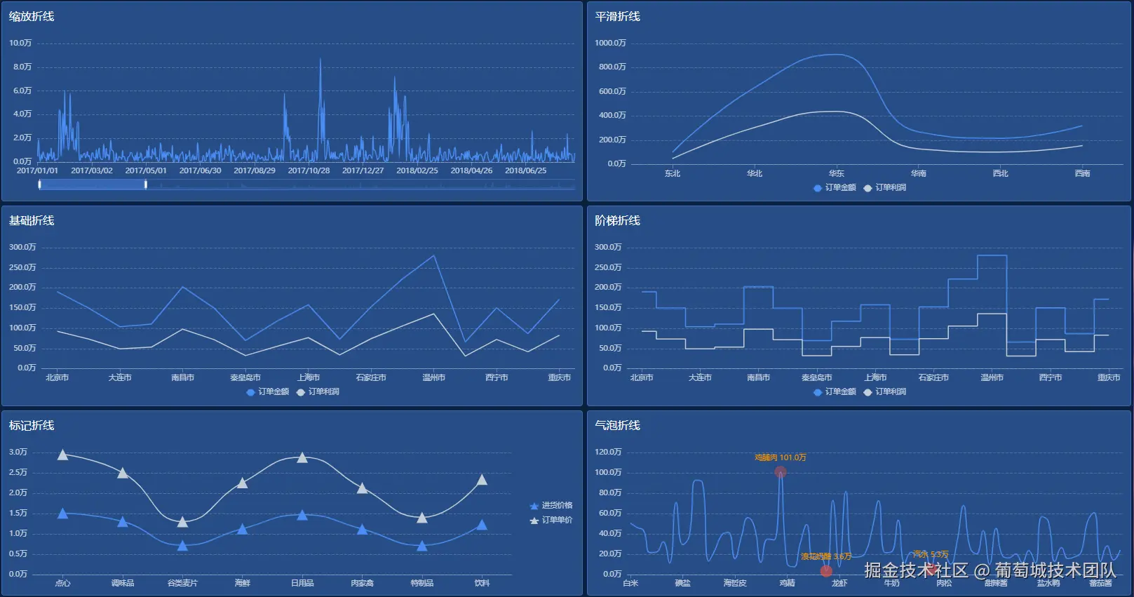 **(1)特点:**趋势类图表反映事物随时间或有序类别而变化的趋势。使用图形的位置表现数据在连续区域上的分布,通常展示数据在连续区域上的大小变化的规律。