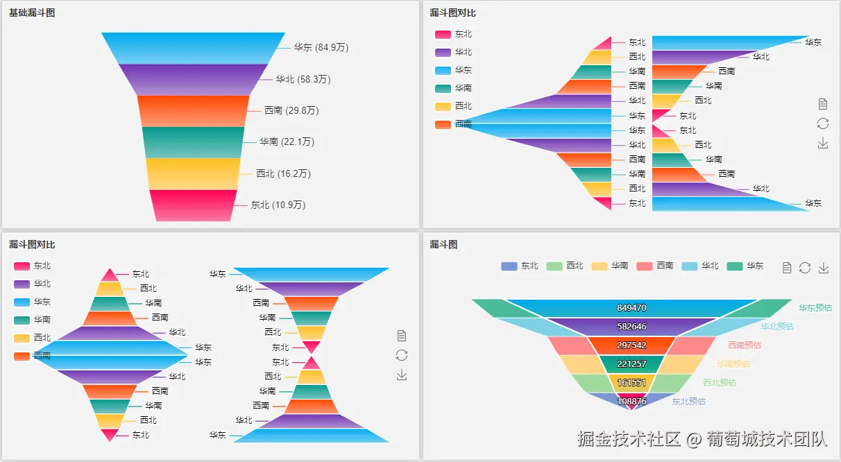 **(1)特点:**流程类图表显示流程流转和流程流量。一般流程都会呈现出多个环节,每个环节之间会有相应的流量关系,这类图形可以很好的表示这些关系。漏斗图适用于业务流程比较规范、周期长、环节多的单流程单向分析,通过漏斗各环节业务数据的比较能够直观地发现和说明问题所在的环节,进而做出决策。