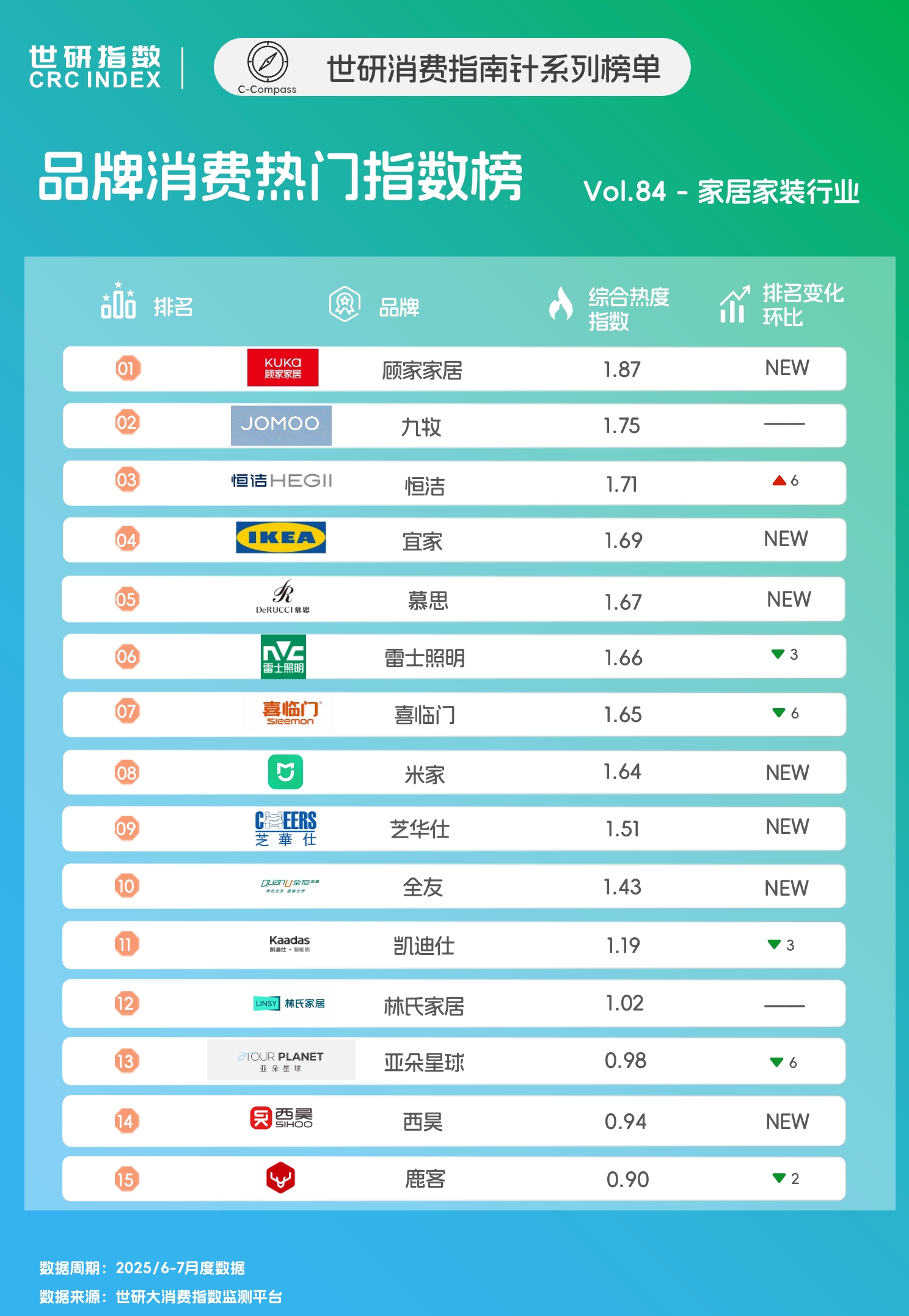 本次监测周期内,顾家家居、九牧和恒洁分别以1.87、1.75和1.71的综合热度位列榜单综合热度前三。