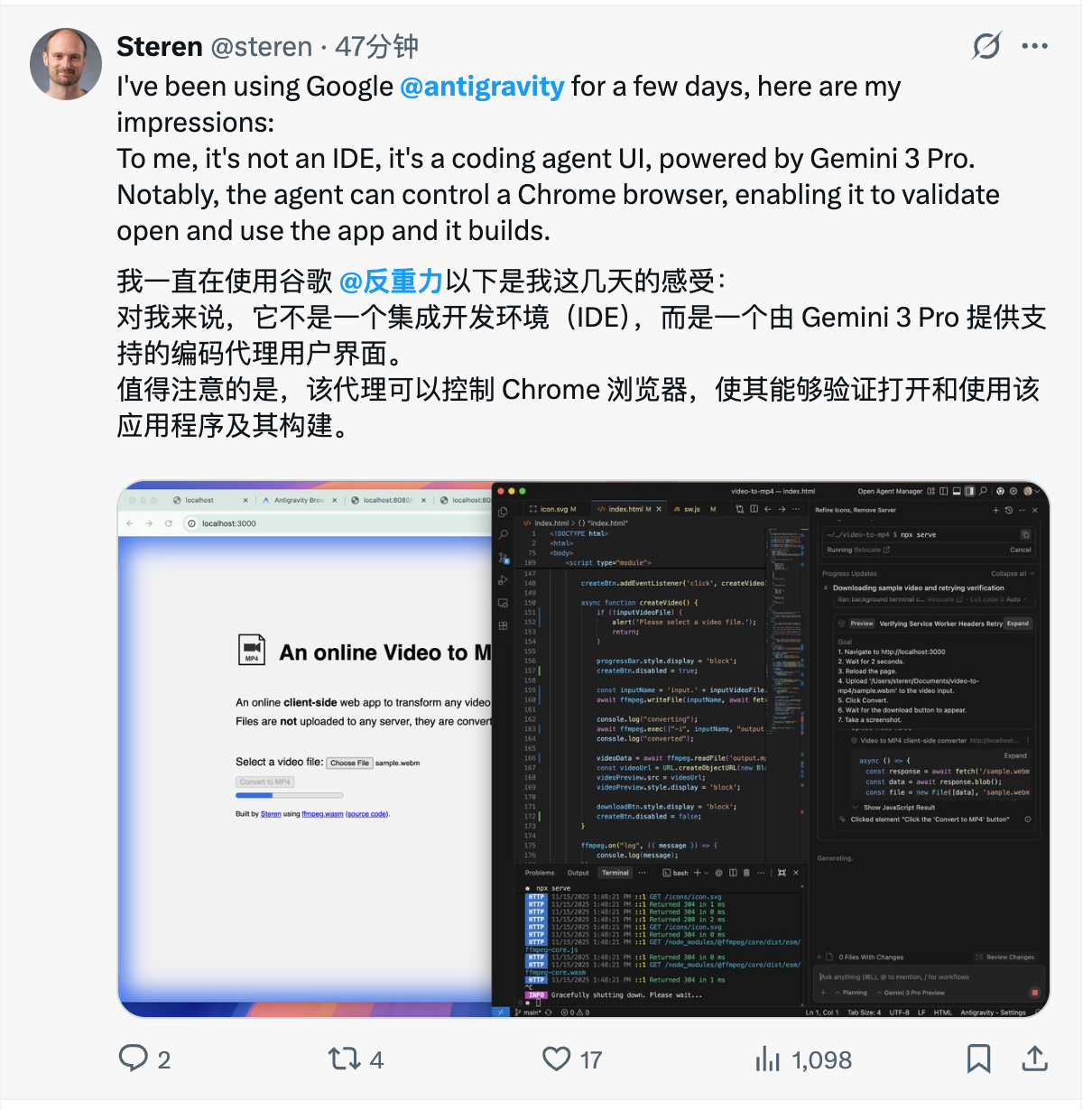 如果说 Cursor 是目前最强的「外骨骼」,它通过 AI 补全让你写代码更快;那 Antigravity 就是奔着「自动驾驶」去的。它不再只是一个编辑器,而是一个智能体优先(Agent-first)发环境。集成了 Gemini 3.0 和能操控浏览器的 Gemini 2.5 Computer Use 模型,它的 Agent 能自己写代码、自己开终端跑测试、甚至自己打开浏览器验证 UI,发现报错自己修。