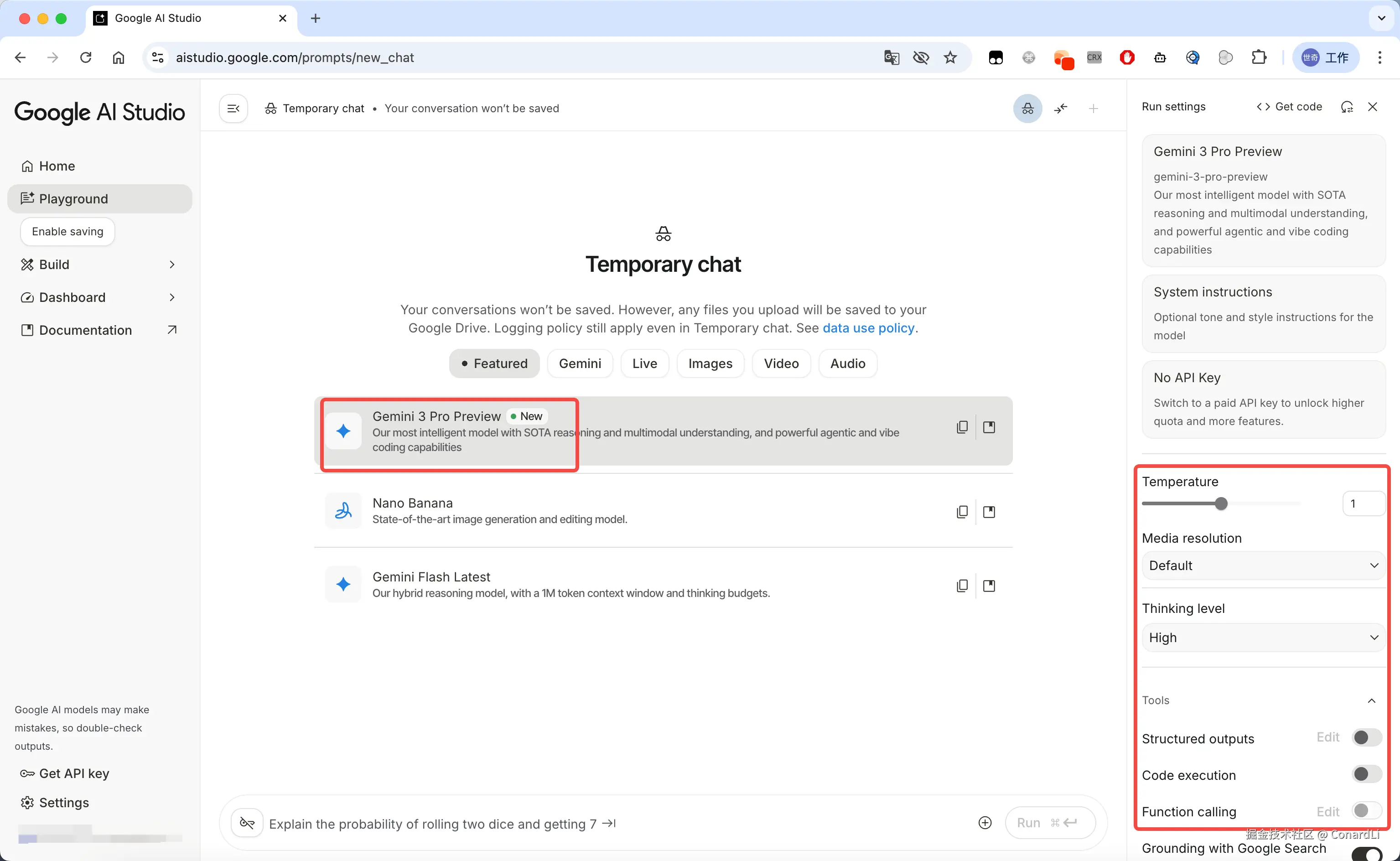 在 Build 模式下,我们还可以直接选择官方提供的各种插件,比如前段时间比较火的 Nano Banana(Gemini 的生图模型),以及 Google Map、Veo 等服务: