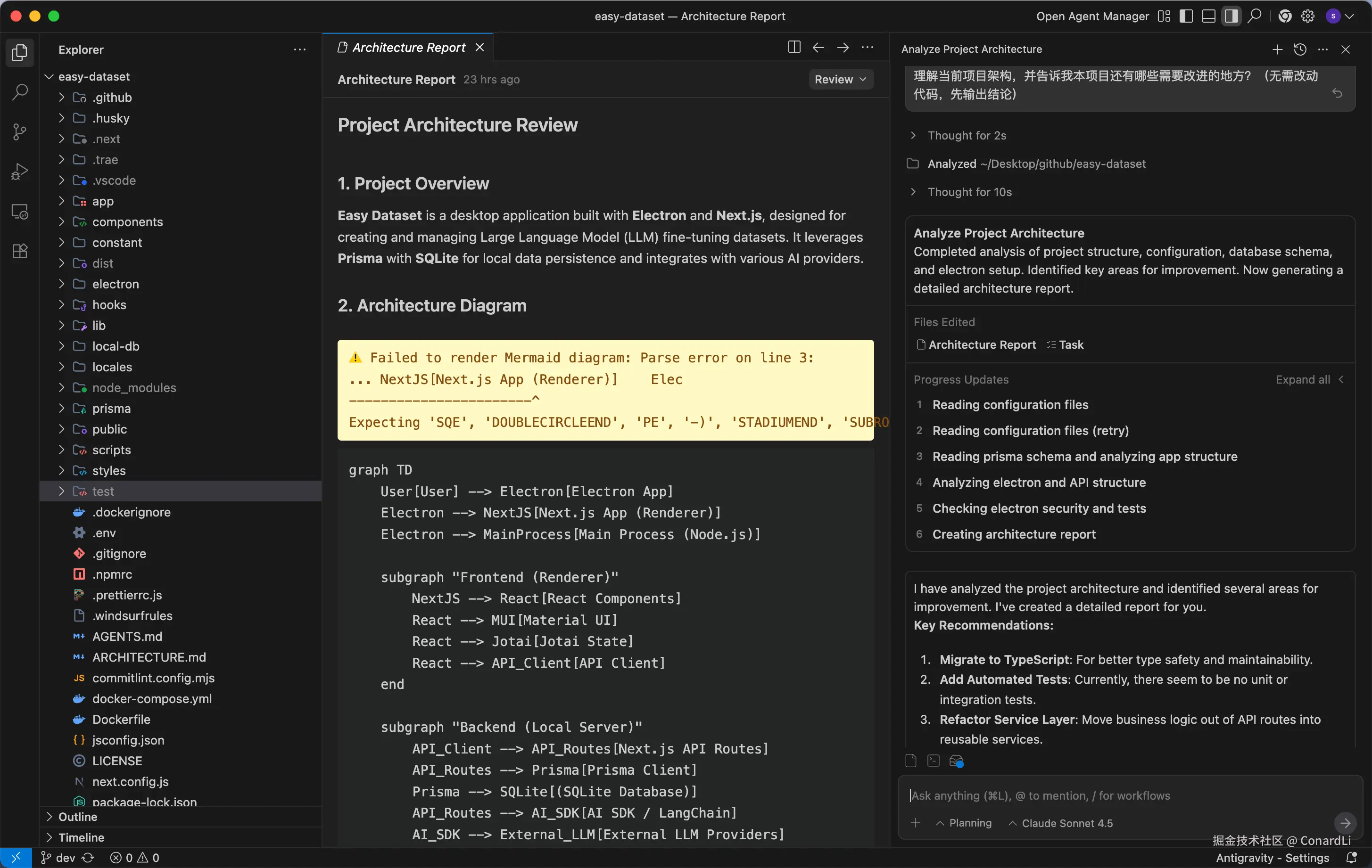 第一局,我们来测试一下模型的项目理解能力,我们让他对一个大型的项目,进行整体的分析和产出优化建议,我们选择 Easy Dataset 这个项目。