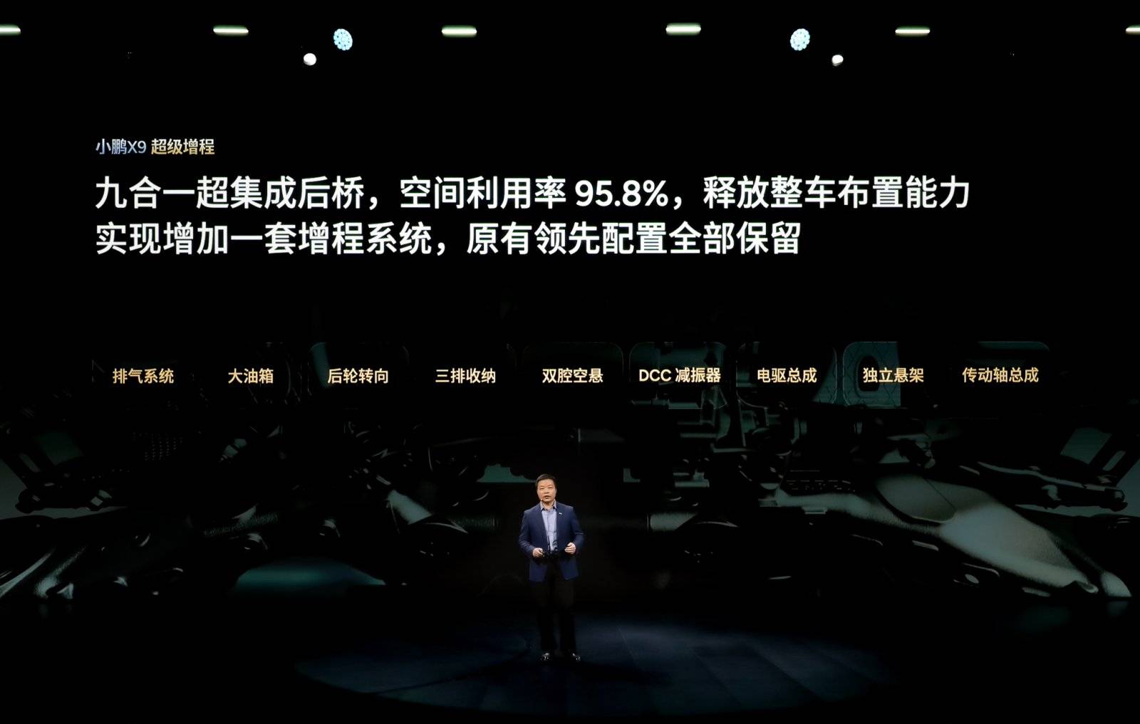 小鹏为此研发了一套名为「鲲鹏超级集成架构」的工程方案。其后桥采用全球首创的「9 合 1」设计,将增程器排气系统、60L 油箱、主动式后轮转向、第三排 4/6 分独立电动座椅收纳机构、双腔空气悬架、智能可变阻尼减振器、同轴电驱总成、H 臂多连杆独立悬架以及传动轴等九大功能模块,高度集成于同一紧凑区域,整体空间利用率达 95.8%,在保障性能的同时,最大限度释放了乘员舱与行李空间。
