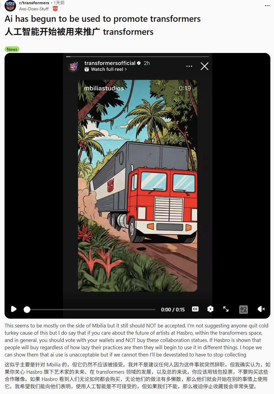 起因是在transformer(变形金刚)的分社区中有位用户发布了一个视频,关于变形金刚官方转载mbilia工作室用AI制作的一个广告。