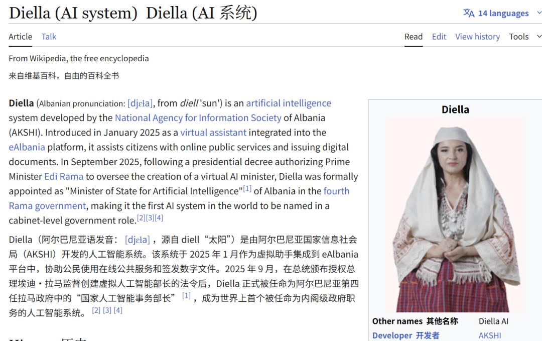 位于巴尔干区域的阿尔巴尼亚政府近年来一直在追求“数字化转型+反腐败”。2025年9月,阿尔巴尼亚总理埃迪·拉马(Edi Rama)宣布:他们任命了一个由人工智能系统(AI System)作为阿尔巴尼亚第四任拉马政府中的“国家人工智能事务部长”,名为 Diella(意为“太阳”)。这也是世界上首个被任命为内阁级政府职务的人工智能系统。
