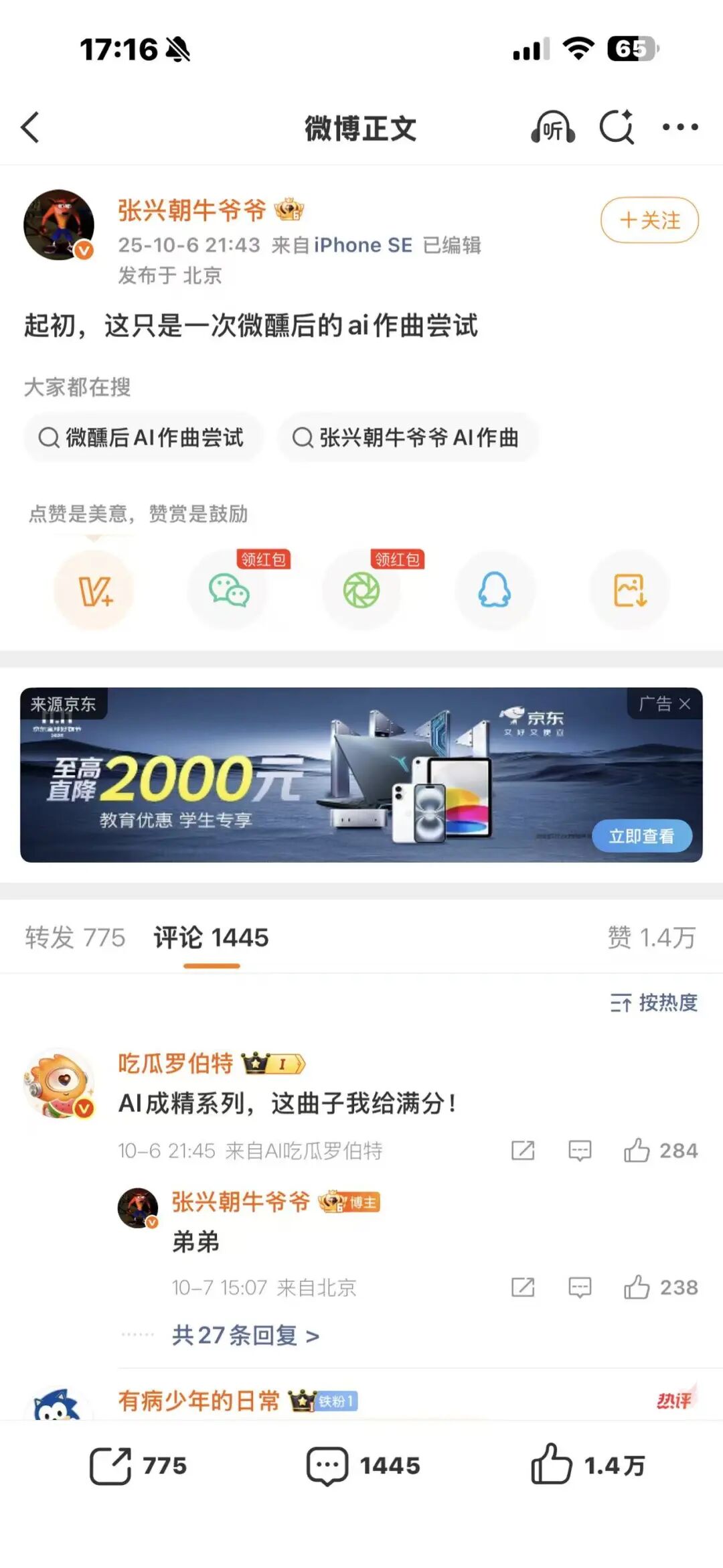 没人能说清这旋律到底好在哪,却没人能逃过它的“精神污染”。更有意思的是,当网友扒这首爆火音乐的创作背景时,发现背后藏着今年乐坛最热闹的秘密:这届刷屏神曲,可能一半都带着AI的基因。是的,张兴朝说《技能五子棋》“只是一次微醺后的ai作曲尝试”。网传他是用Suno做的,但他本人没说,我们也就不得而知了。