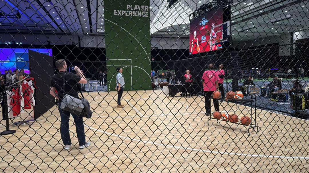 展馆中央的 NBA VR 体验区格外引人注目。戴上头显后,你不再是个被固定在座位上观看 360 度全景的观众,而是能以裁判甚至球员的视角,自由观看比赛名场面。更令人惊喜的是,系统还能实时展示投篮难度、防守统计等高端数据分析。