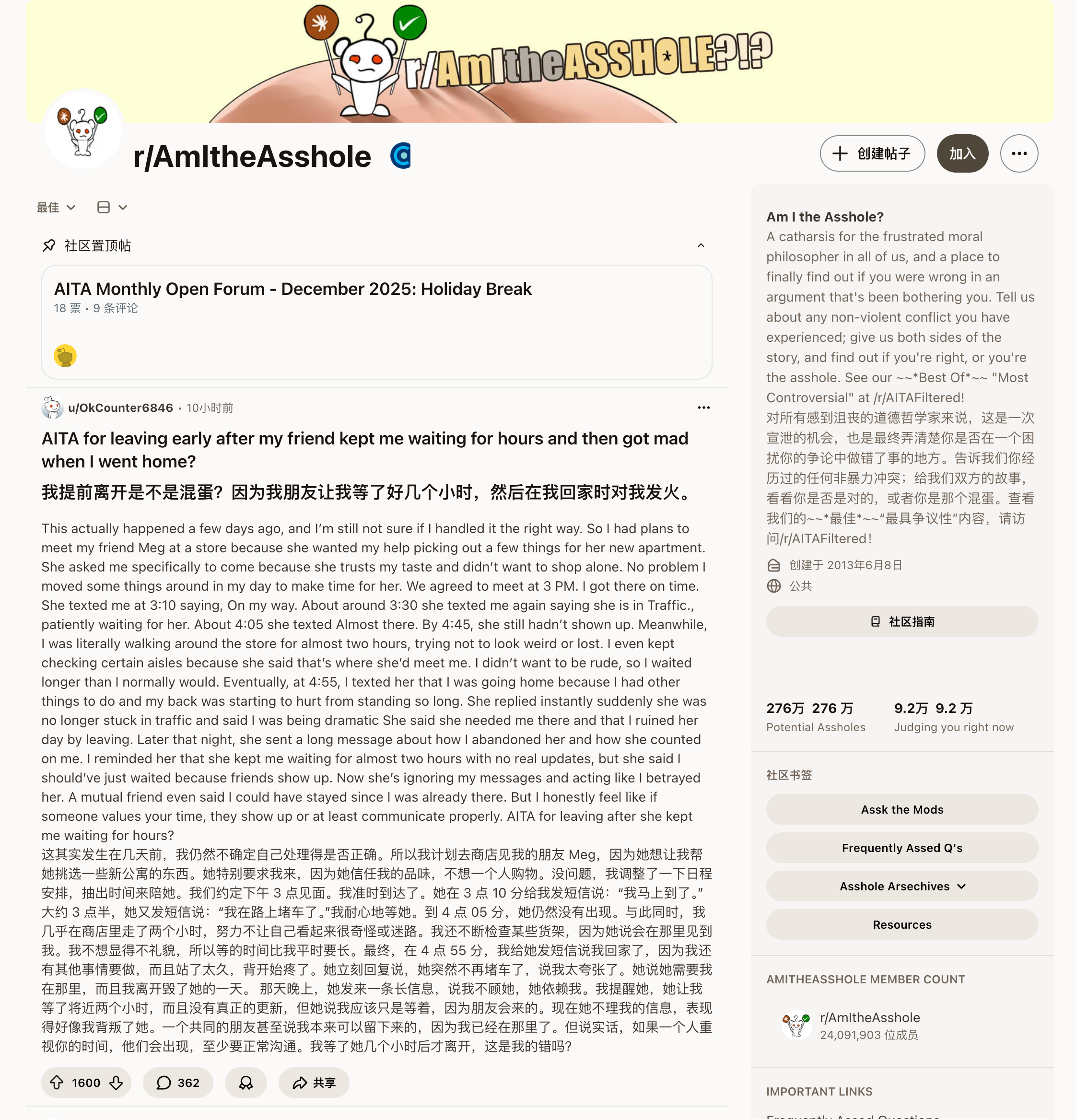 ▲Reddit「我是混蛋吗」版块有超过 2400 万成员,里面分享的内容大多是个人故事