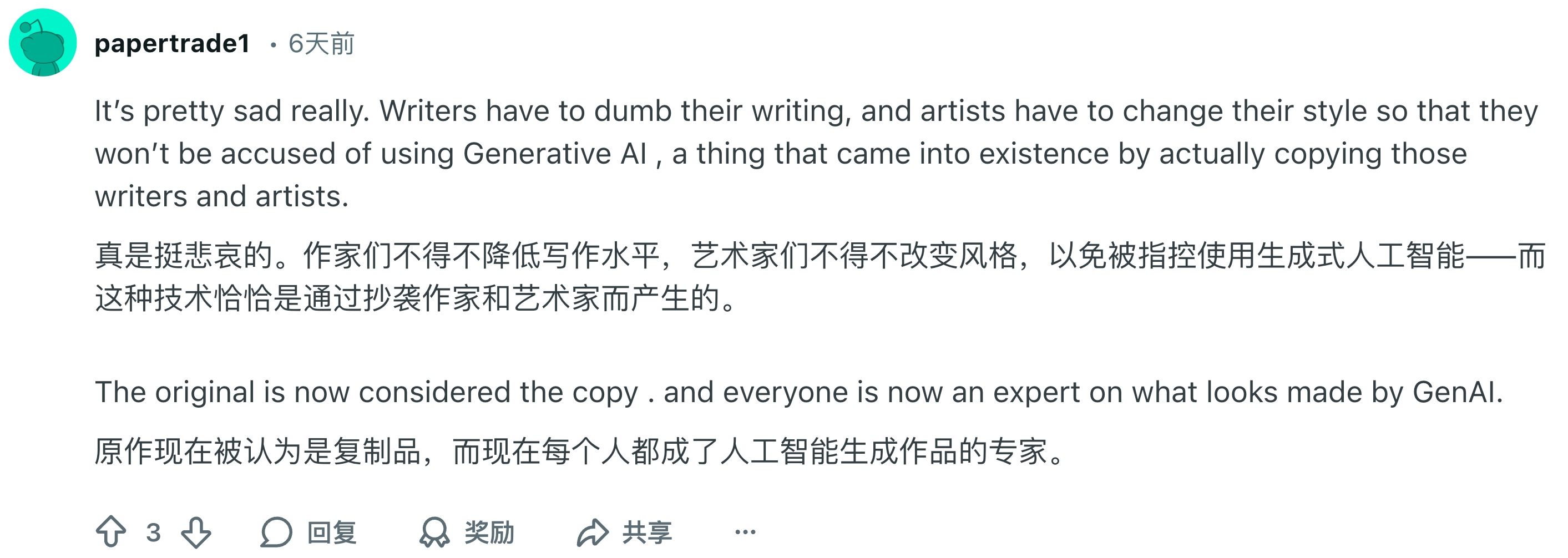 ▲Reddit 帖子链接:https://www.reddit.com/r/artificial/comments/1pci14r/writing_detection_tools_preventing_people_from/