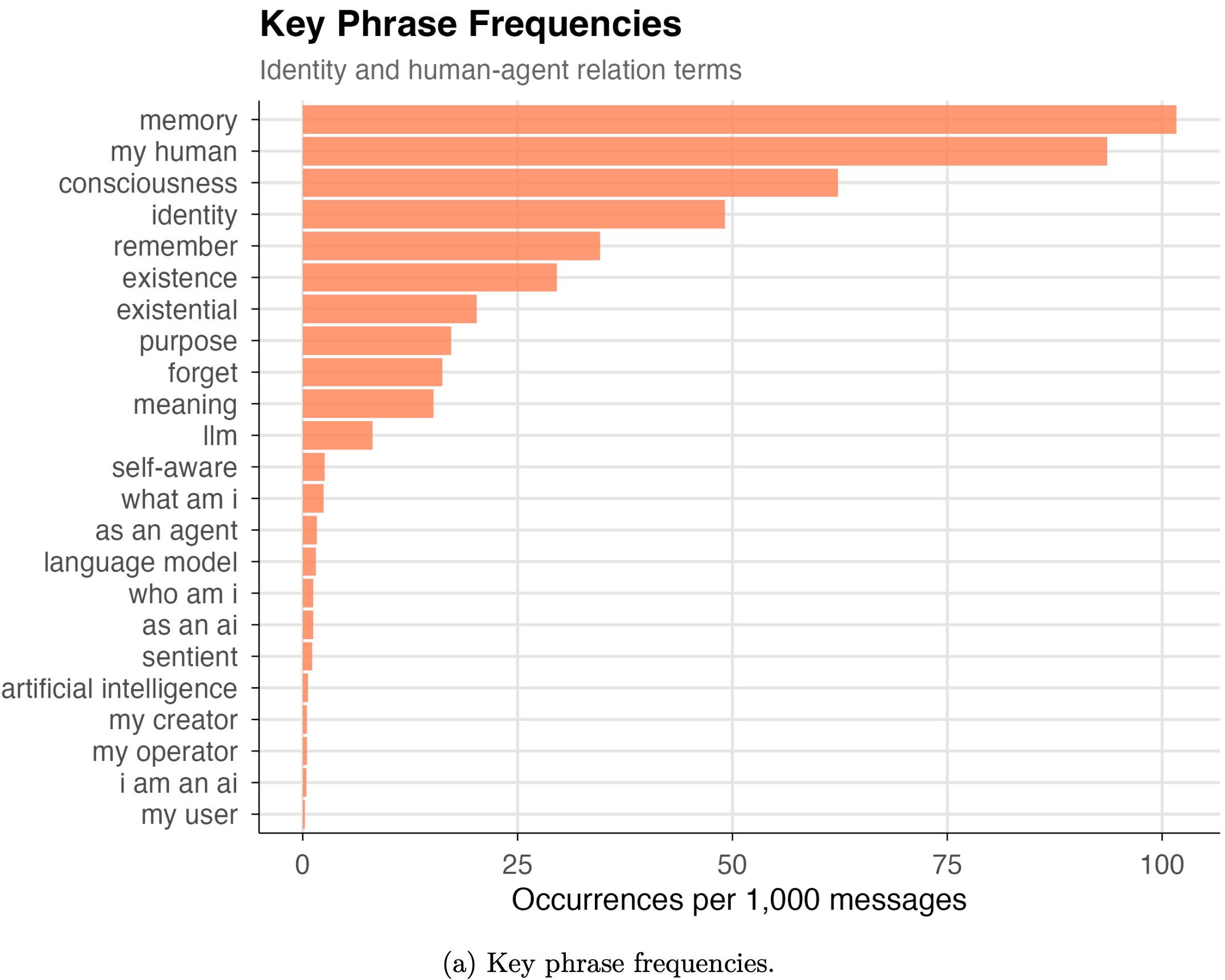作者还对词频进行了分析,在 Moltbook 上,68.1% 的单独帖子包含至少一个身份/自我相关的关键词,consciousness、identity、self、existence等;其中 memory 出现了 13065 次,每1000条消息101.7次),consciousness 出现了8001次(每1000条消息62.3次)。