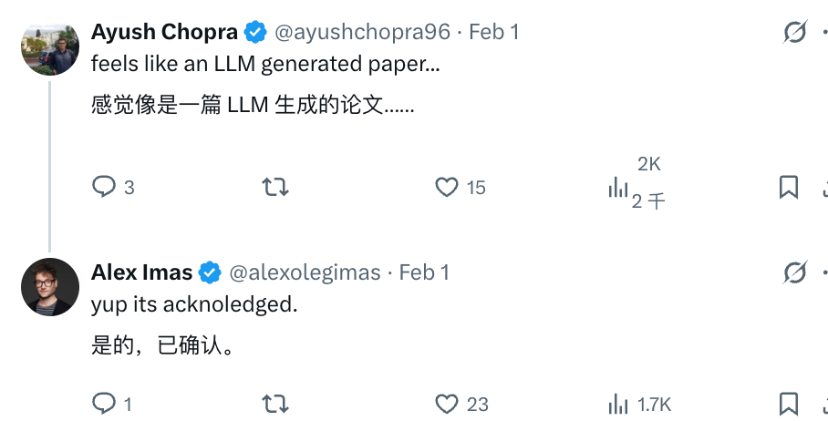 然而尴尬的是,这篇内容翔实,分析到位的论文,有网友在评论区说,「怎么看着像是 AI 写的论文」,然后发帖的博主回复,确实是 AI 写的。