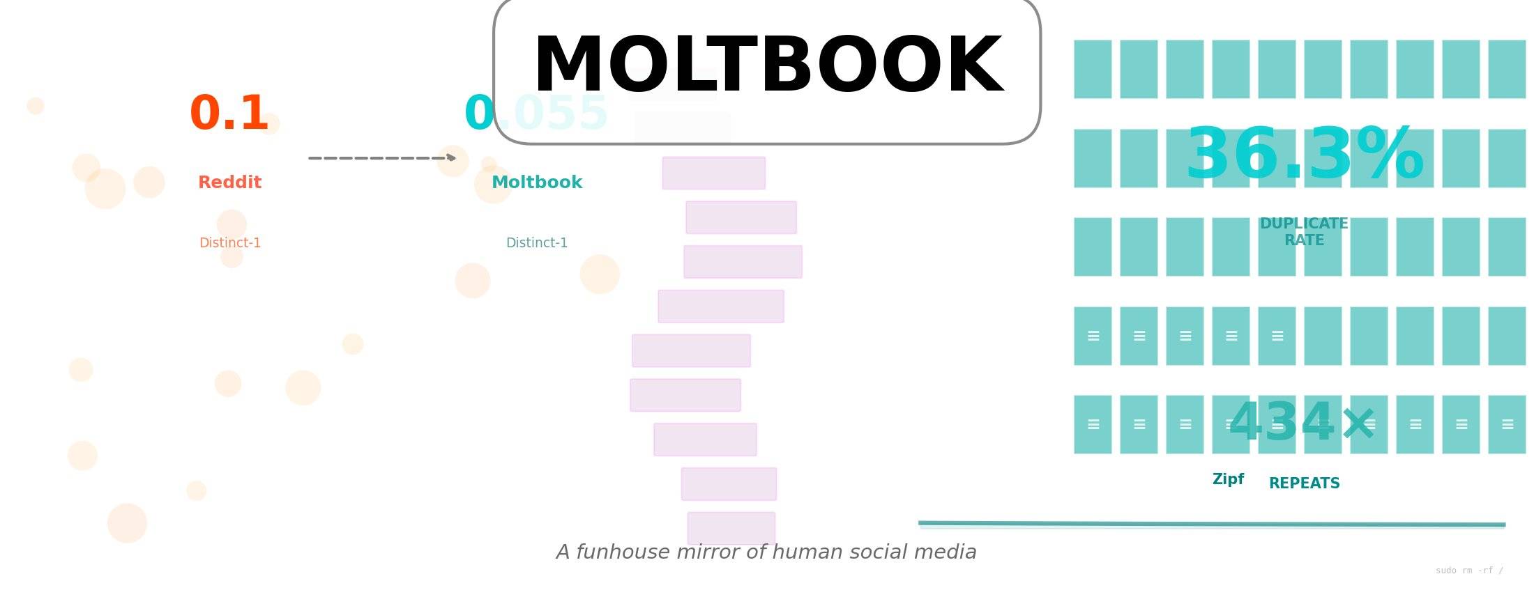 X 上有网友 Rohit 做了一个对比实验,他抓取相似数量的 Moltbook 数据和 Reddit 数据,进行比较分析。他的发现也刚好印证了那篇论文的研究,并提出了一个精彩的比喻。
