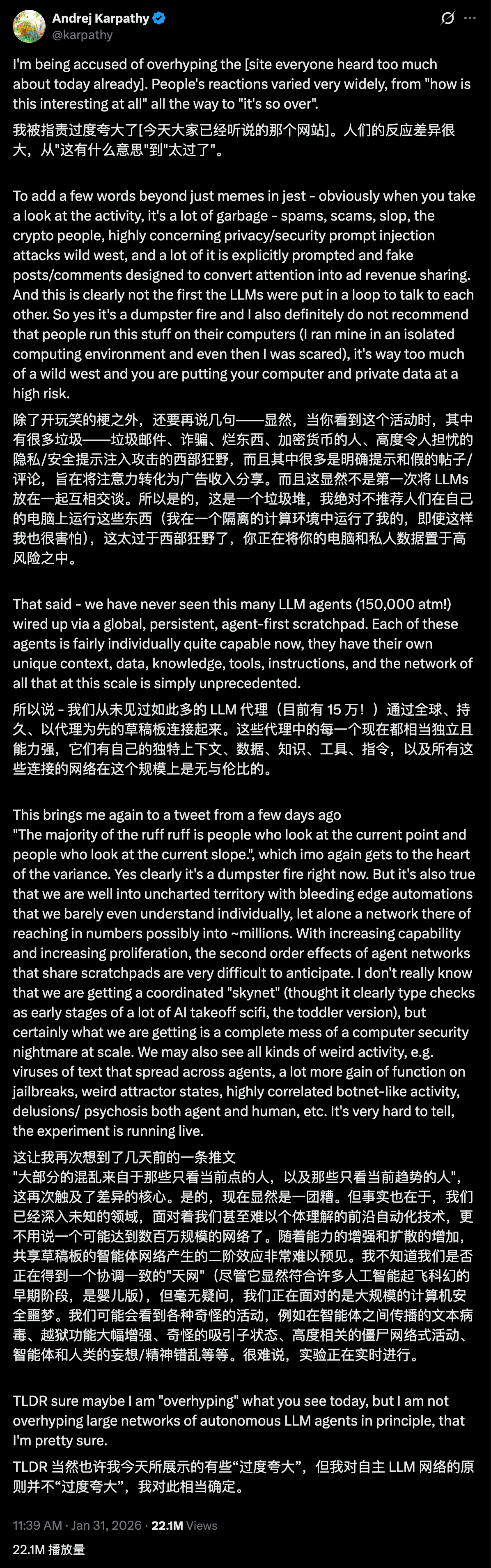 但另一方面他也说。「我们从未见过这么多 LLM agents(现在是 150 万),通过一个全球性的、持久的、Agent 优先的留言板连接起来。每个 Agents 现在都相当有能力,它们有自己独特的上下文、数据、知识、工具、指令,而这种规模的网络是前所未有的。」