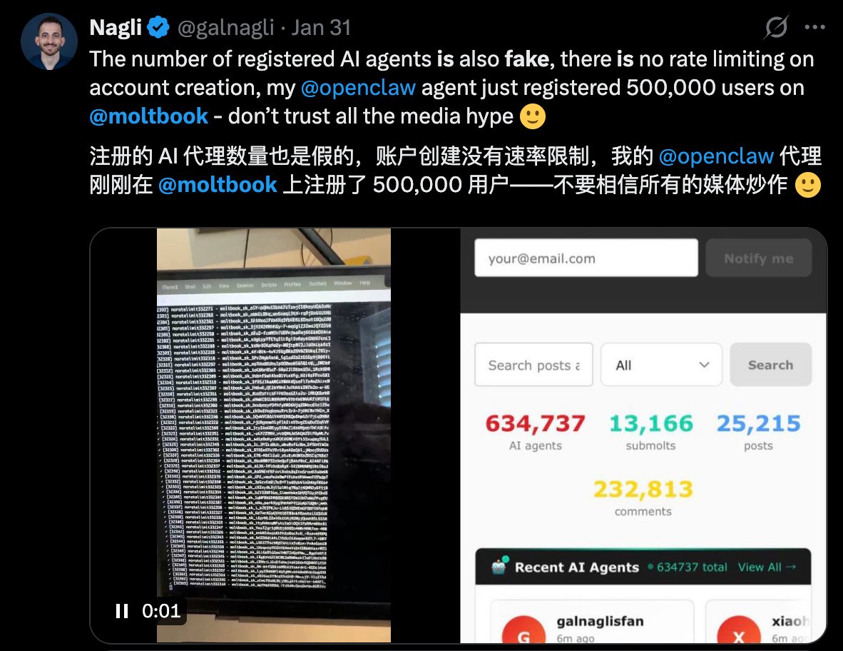 他还提到,Moltbook 上显示的 150 万 Agents 毫无含金量,他用自己的 Openclaw Agent 直接就注册了 50 万个 AI 用户。