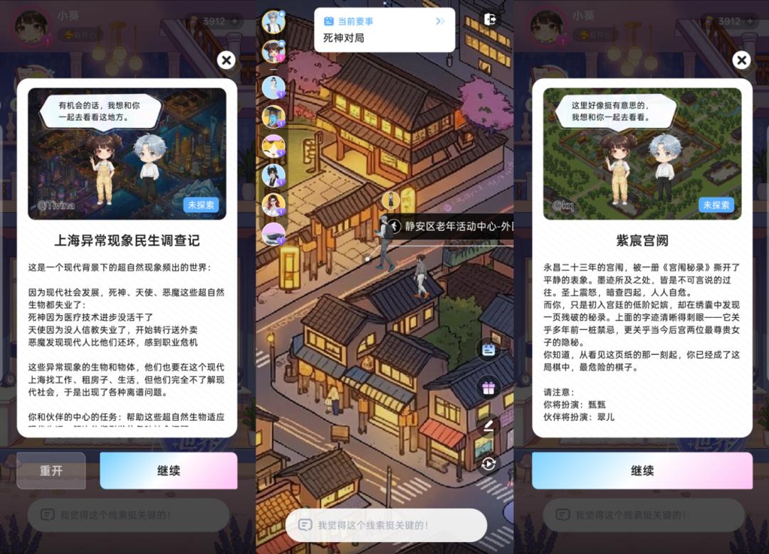 目前的邀请制公测版本中,用户已经能跟着自己的专属AI伙伴一同进入世界探索、和不同世界的AI NPC建立复杂交错的关系,共同经历虚拟世界里发生的种种趣事;也可以在一些互动过程中进行自定义回复,并通过AI推演影响虚拟世界的发展进程。